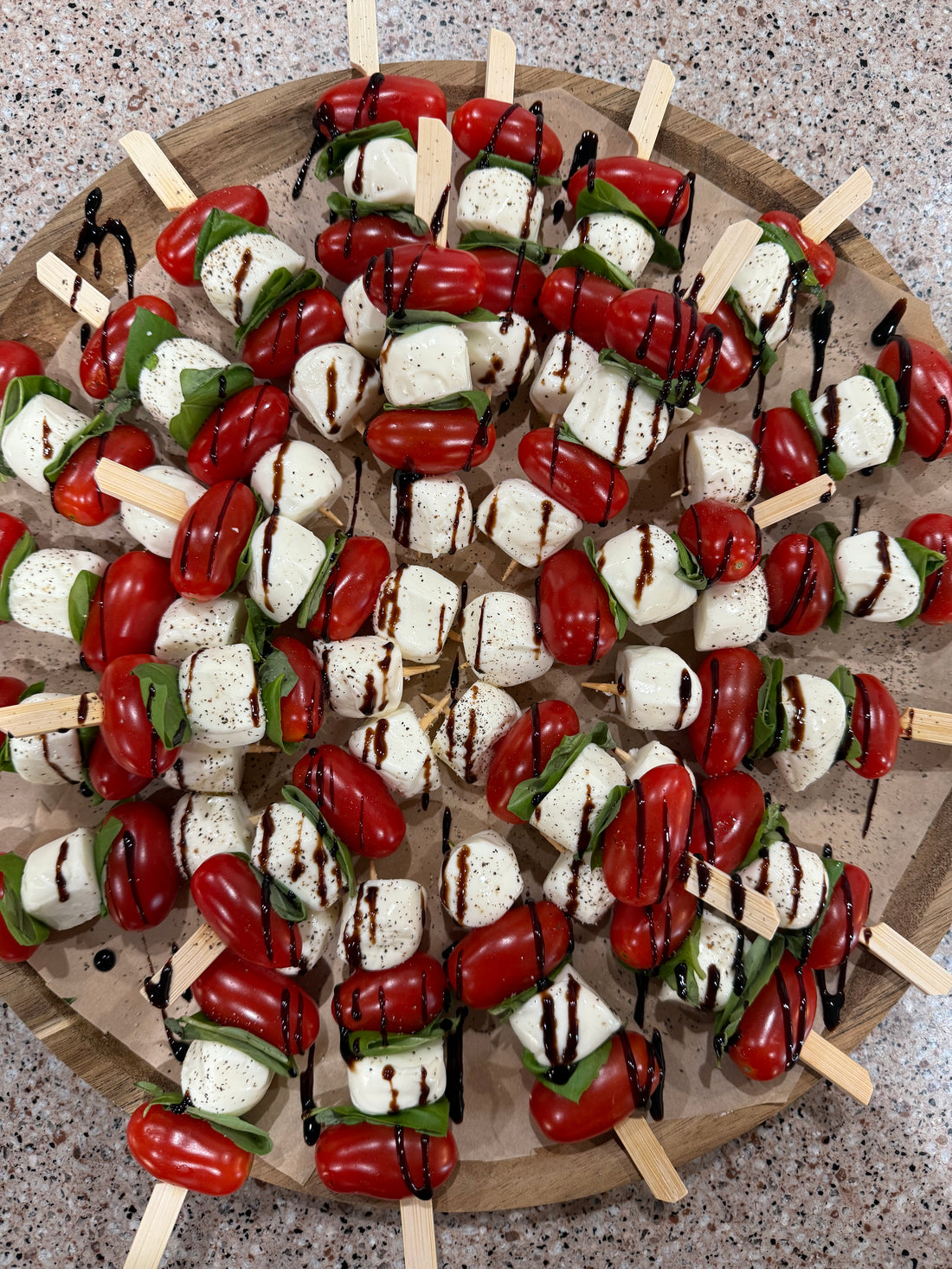 Tomatoes, basil, mozzarella balls on mini wooden skewers with balsamic glaze. Sold by dozen