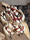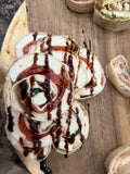 Pinwheel. Fresh mozzarella, tomato, basil, balsamic glaze. Sold by the dozen.