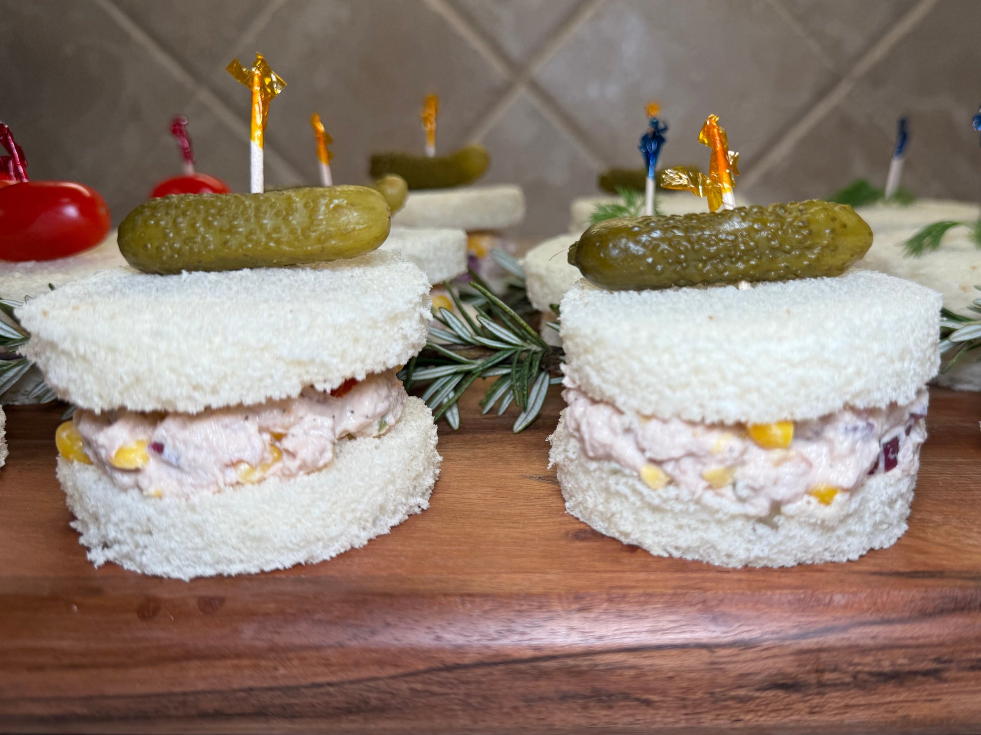 Sandwich. Tuna, mayonnaise, celery, red onion, tomato, salt, ground black pepper. Sold by the dozen.